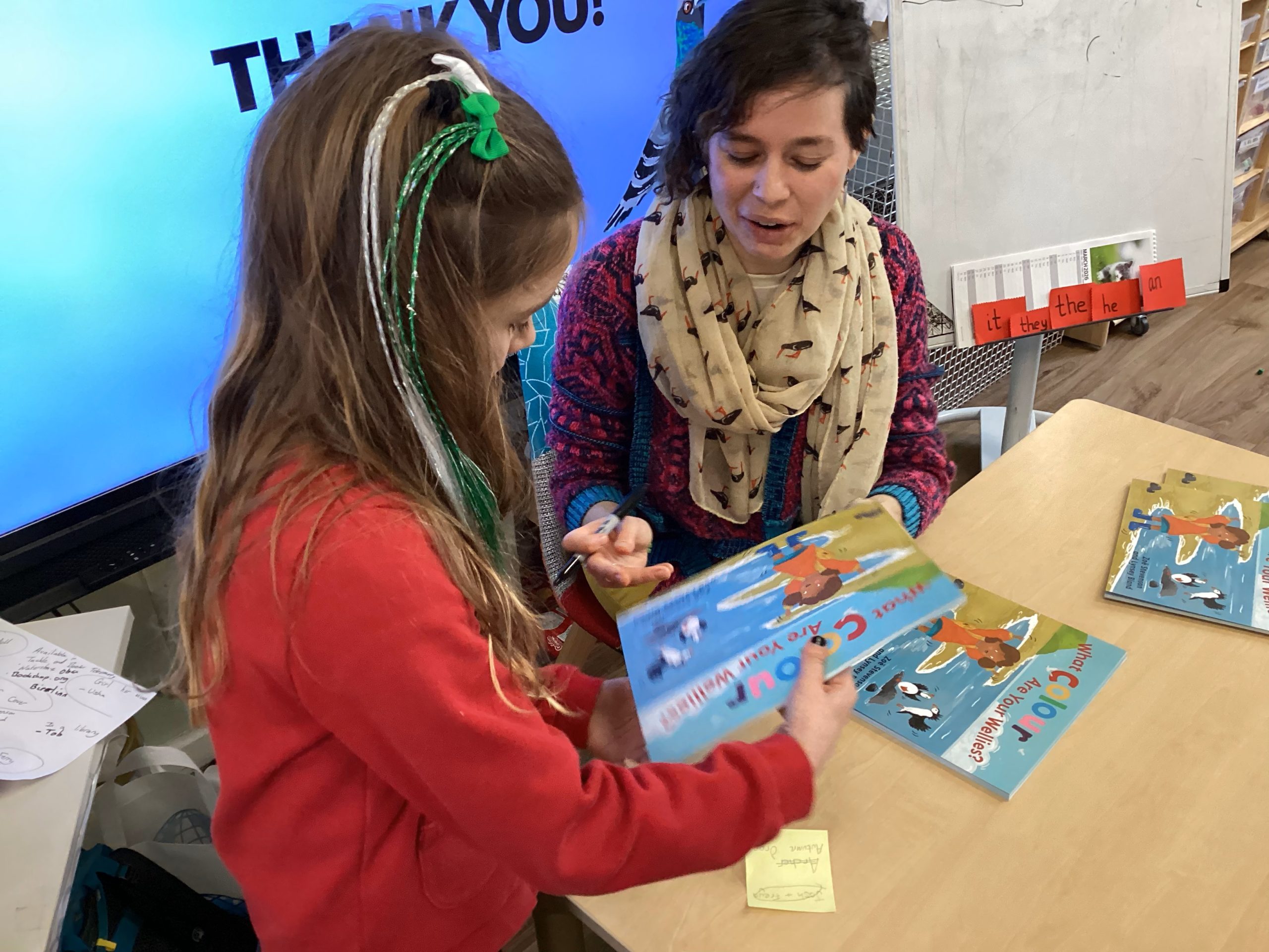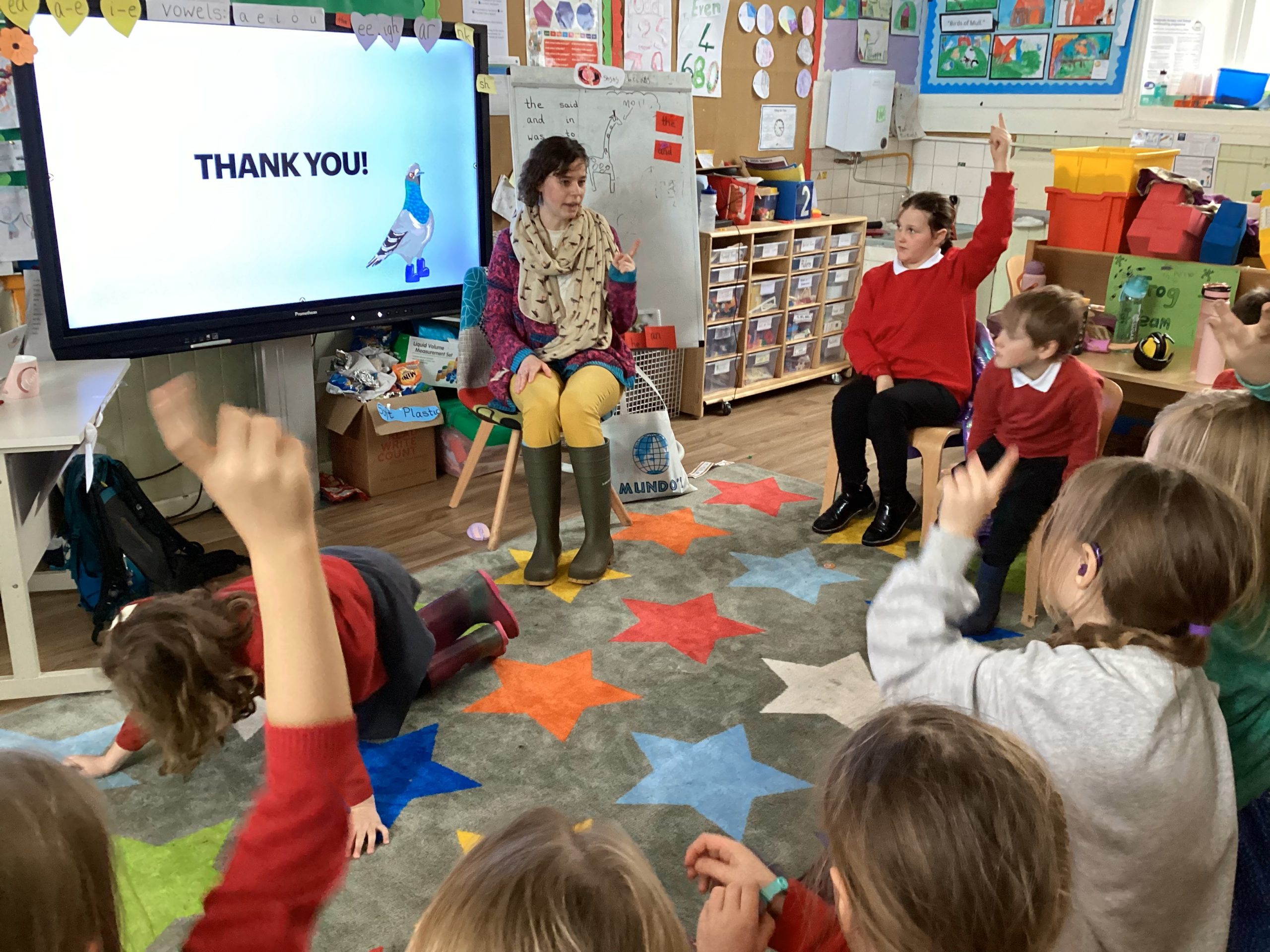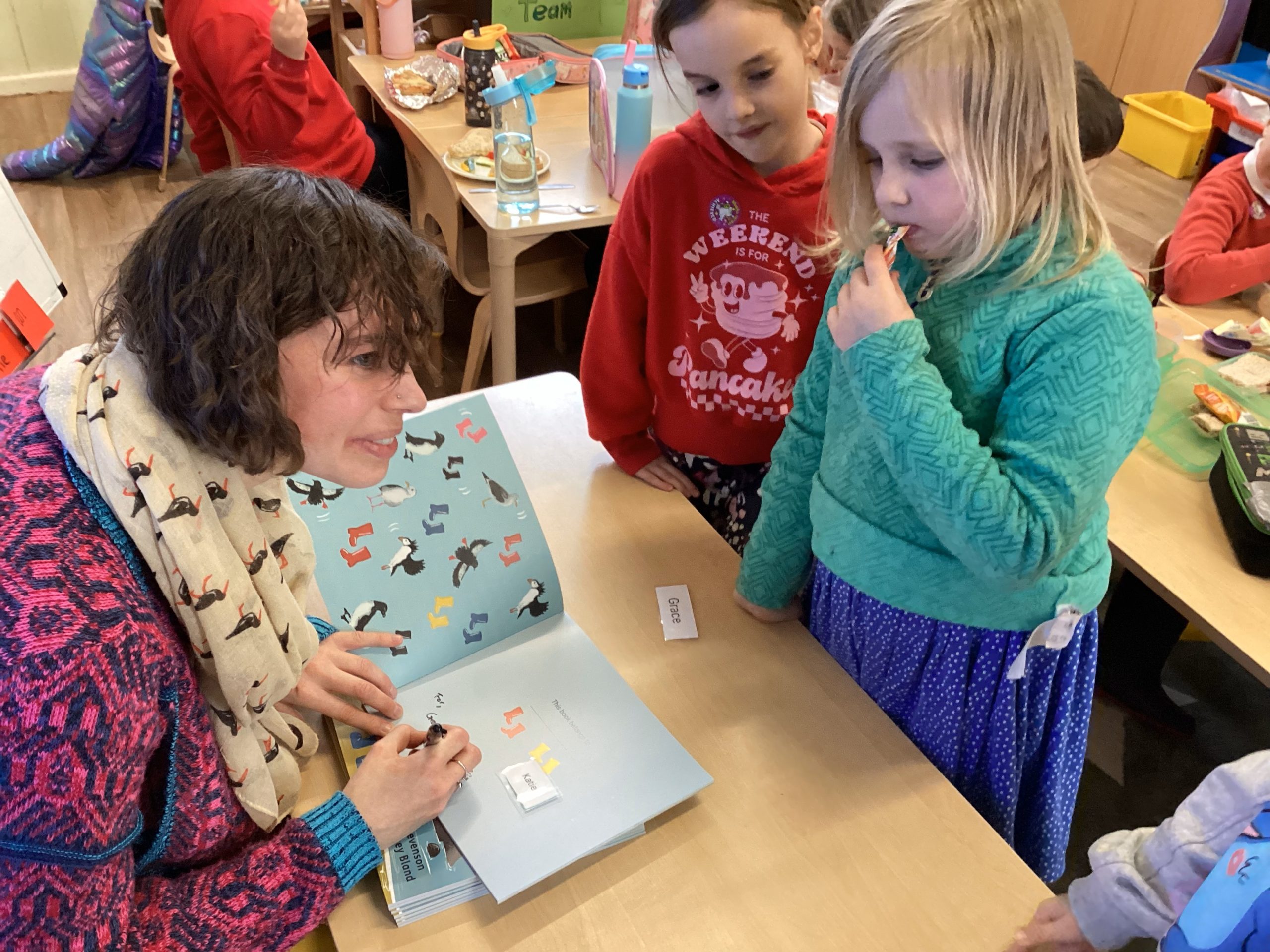 We all wore our own wellies and Zoe liked our wellies. Some of us bought books from Zoe. She signed them and she wrote us our own special message. We loved meeting Zoe and we want her to come back and read her next book. We can’t wait. We have made Zoe some lovely cards to say, “Thank you!”